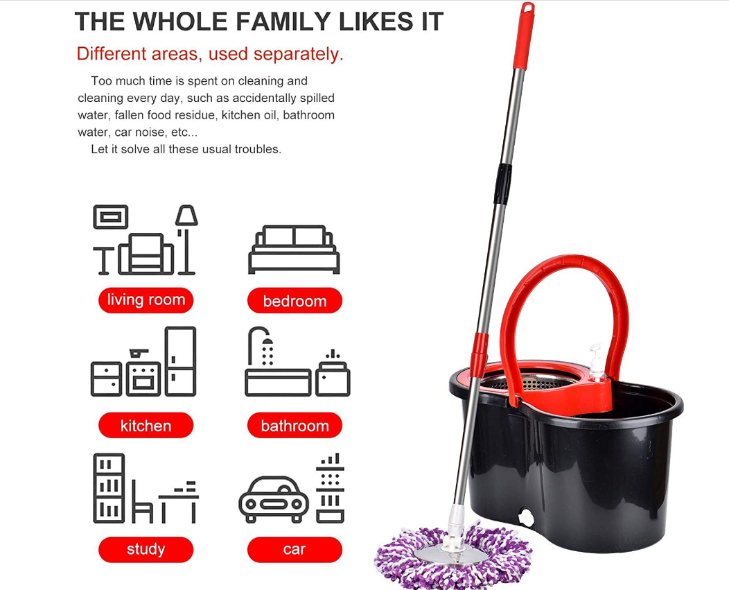 • Efficient spin mop: Our mop and bucket system features a self-washing and spinning basket, which simplifies cleaning and cuts down cleaning time. The built-in wringer basket is designed to contain splash and spray within the bucket, preventing it from reaching the floor during the wringing process.