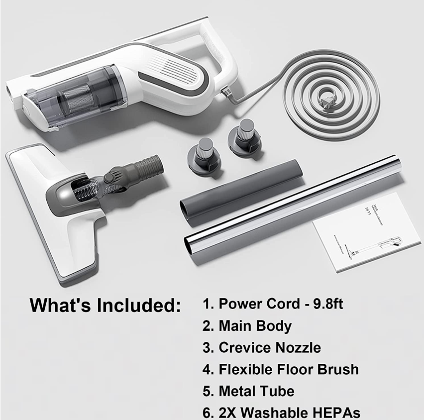 • [What's Included]: -VACLAB Corded Stick Vacuum, 9.8ft Power Cord, Metal Tube, Floor Nozzle, 2 HEPA Filters, Crevice Tool, 1 Year Warranty, and Lifetime 7*24h Technical Support.