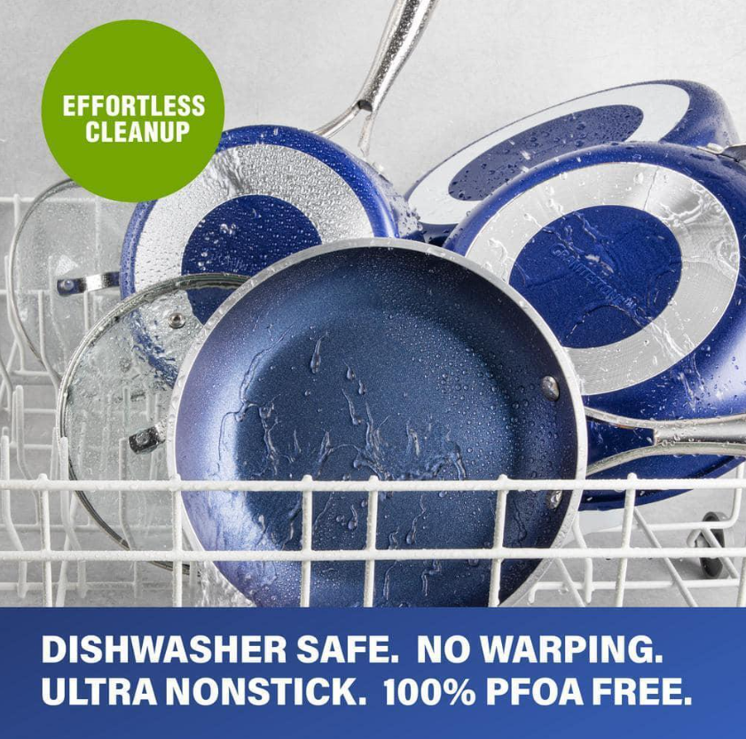 Cook like a pro with this Granitestone 15-piece cookware and bakeware set. Solid aluminum construction ensures even heat distribution. For safe use in the oven, it endures temperatures up to 500 degrees F. The stay-cool stainless steel handles let you move your cookware with comfort. Built to last, it features an extra-thick coating with diamond infusion.