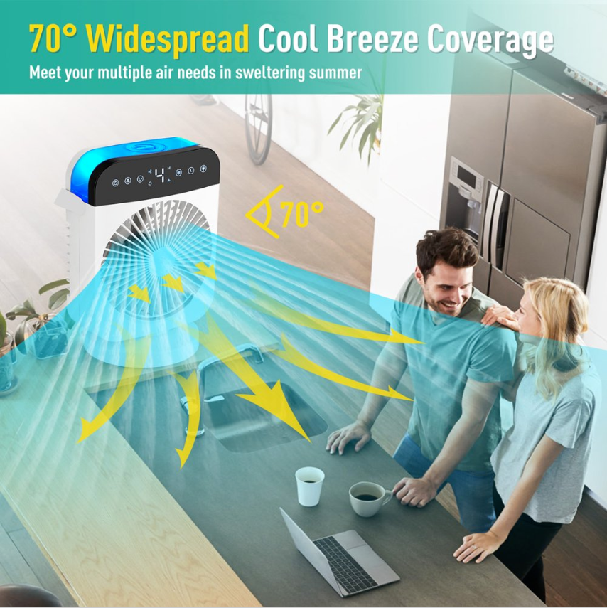 • ❄【Customize Your Breeze with 4 Speeds】The evaporative air cooler fan is designed with 4 wind speeds (Low/Medium/High/Strong).  Wind speed greater than 5m/S, wind distance greater than 4m.  Wind coverage up to 200 sq ft. 90° up and down adjustable air outlet allows blowing the air around you, helping cool you off quickly, which is a good helper to keep cool.