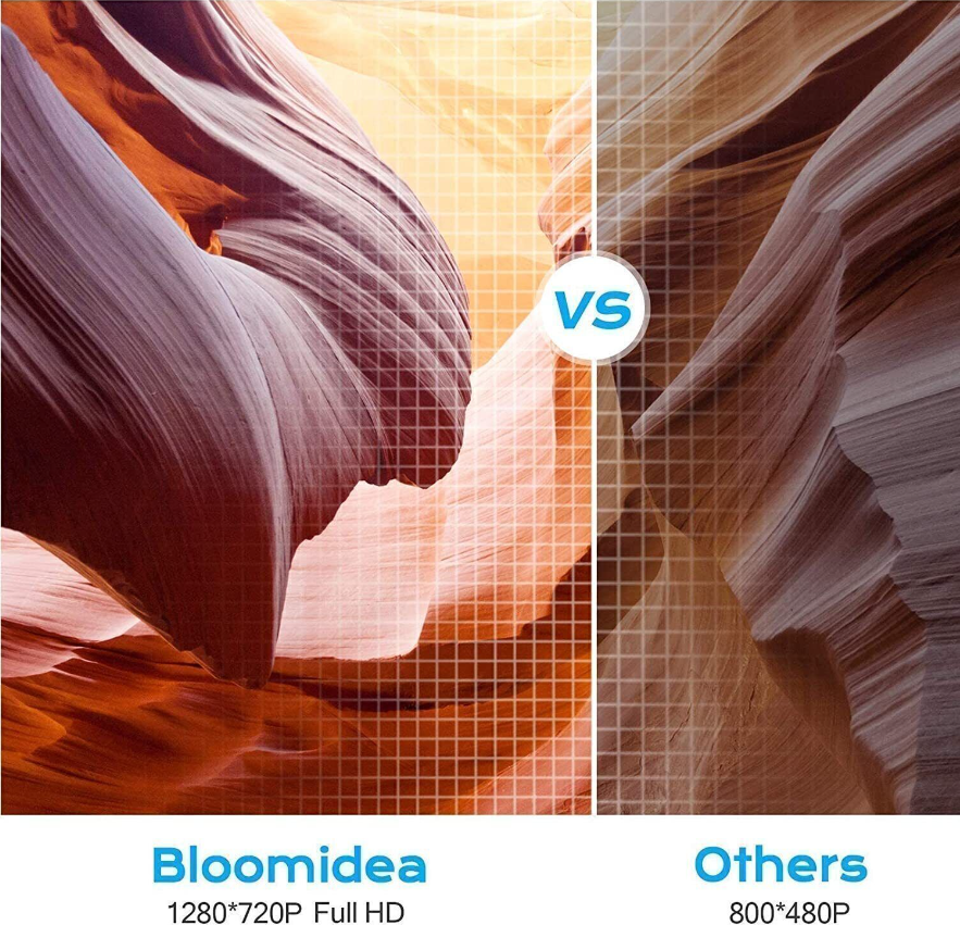 The LED projector with 1280*720P and supporting full HD 1080P, is suitable for indoor and outdoor home theater. Bloomidea movie projector has a simple appearance and is for laptops.Whether indoors or outdoors, the movie projector can effectively project games, pictures, videos, photos and sports events to bring a high-quality life experience.