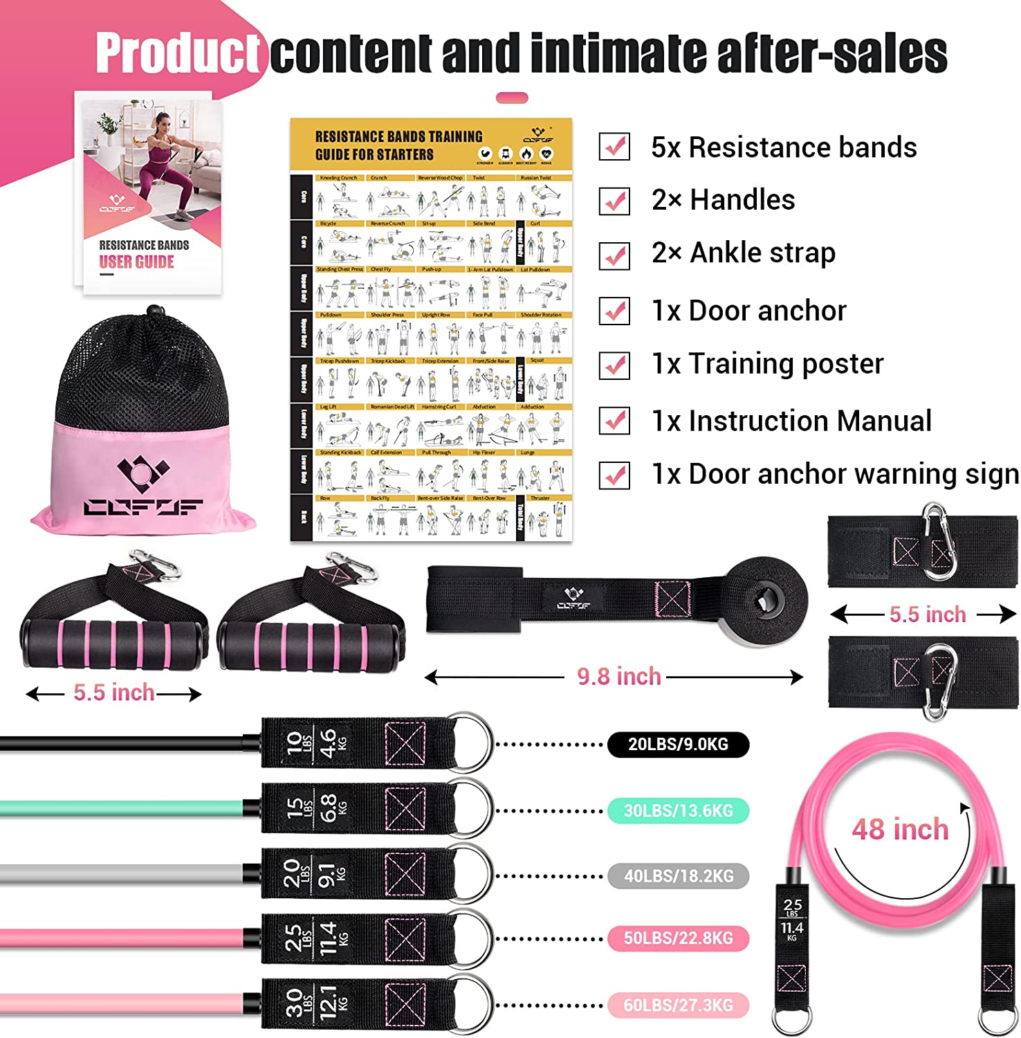5 Resistance Band, 2 Handle, 2 Ankle Strap, 1 Door Anchor, 1 Trai