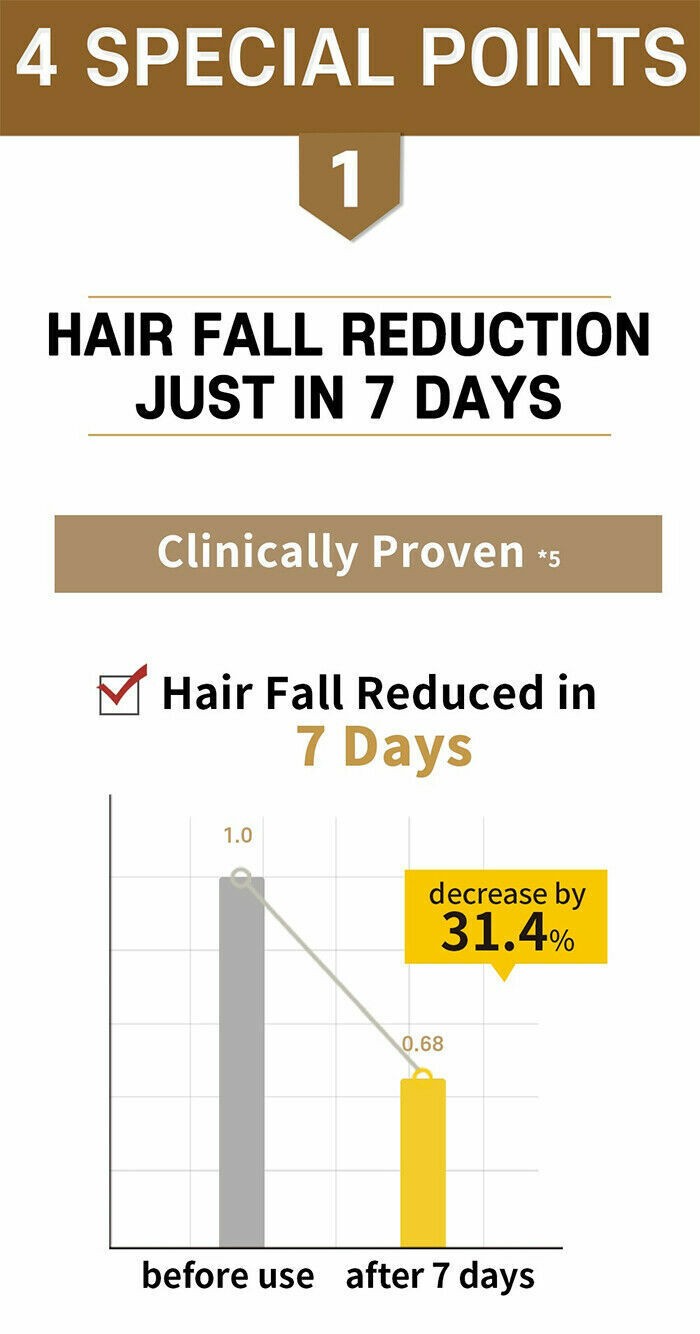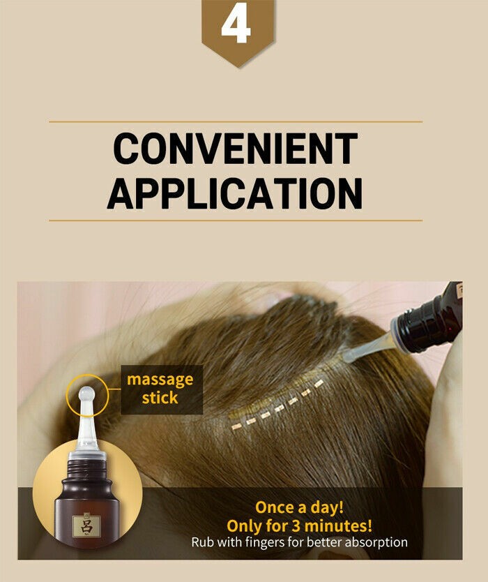 • This two-month usage Ampoule is formulated with 84% high concentration of herbal ingredients such as whole Korean Ginseng, Lingzhi, Wilfordi Root and Ginger to reduce hair fall & strengthen weakened scalp & hair.