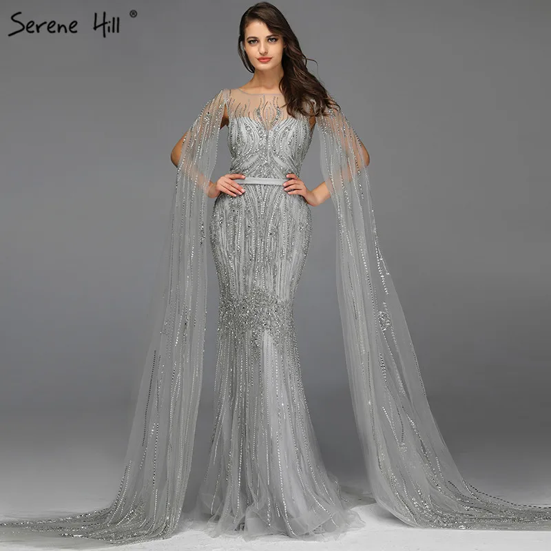 Serene Hill Dubai Pink Luxury Beaded Mermaid Evening Gown For Women 2022 Sexy Detachable Cape Sleeve Formal Party Dress CLA70160