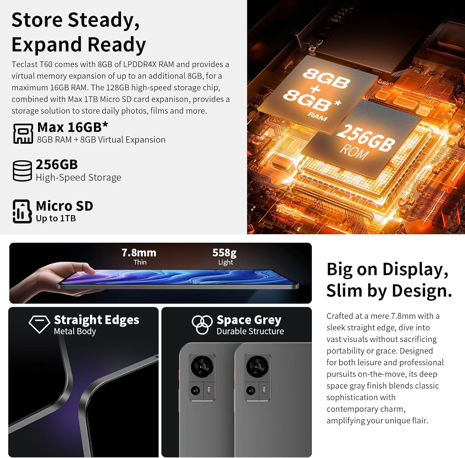 • 【Android 14 tablet, 256GB ROM】2024 new large-capacity Android 14 tablet 12 inch T60 has 16GB RAM (8GB RAM + 8GB extend), 256GB ROM allows you to store more photos and documents. A micro SD card slot expands storage up to 1TB (FAT32 format, sold separately) so you can store all your favorite media files together, including ebooks, videos, photos. The 12 inch T60 tablet with Android 14 and GMS certified, allowing you to download popular apps from the Google Play Store. Additionally, Android 14 operating system and allows you to add a QR code scanner to your lock screen, improving your privacy and security. You can also upgrade your personalization options