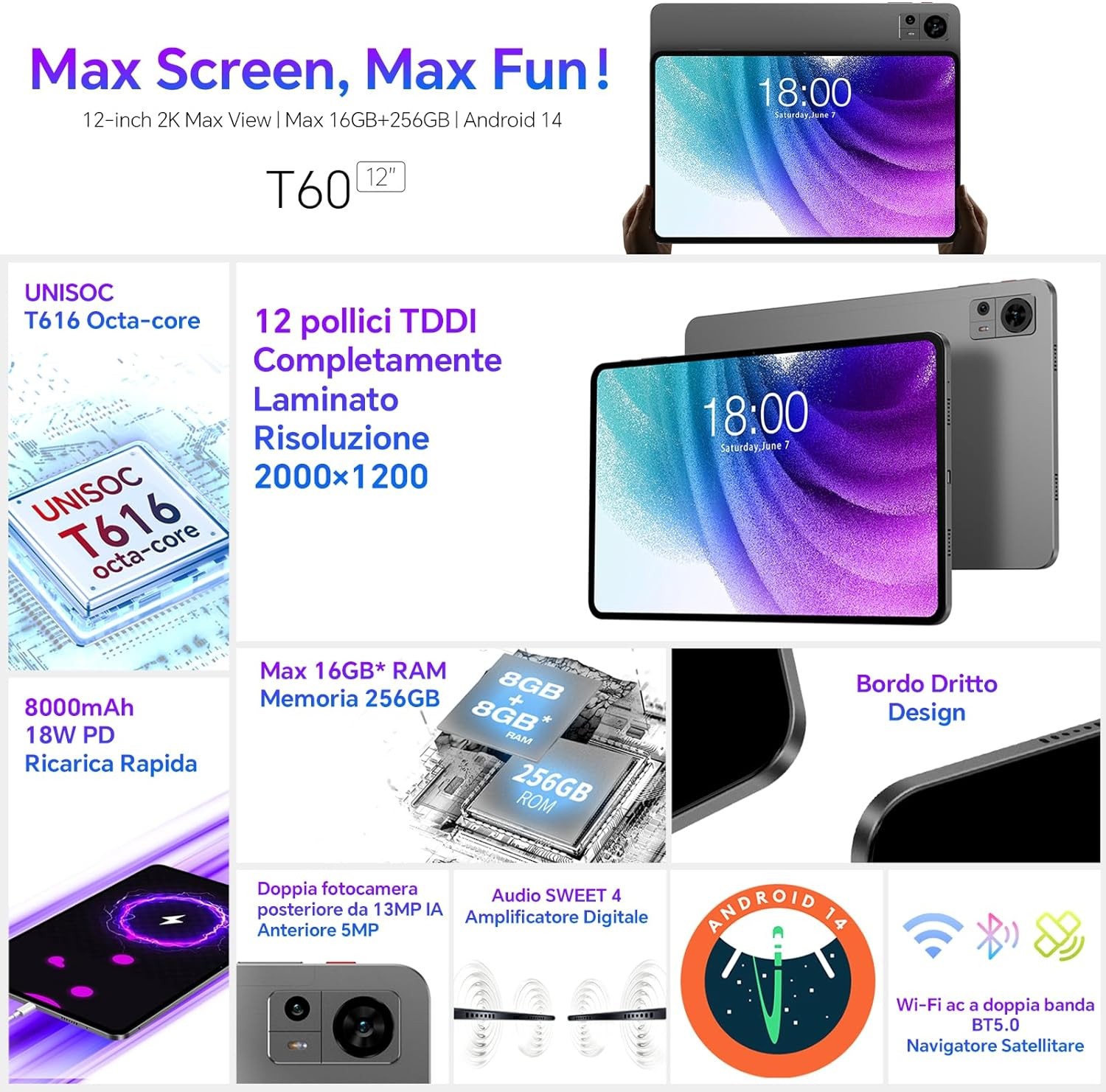TECLAST Tablet 12 inch Android 14 Tablets, T60 with 256GB Storage(Expand to 1TB), Unisoc T616 CPU, 8000mAh +18W PD Fast Charger, 4 Speakers, 5G WiFi+4G LTE, Dual 13MP Camera,GPS
