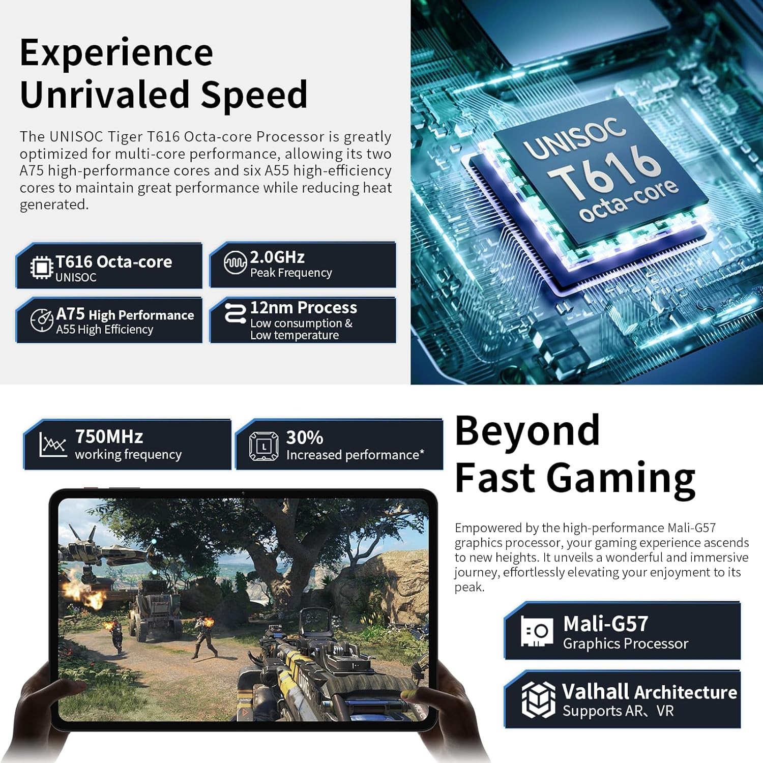 • 【T616 8-core tablet + 8000mAh + 18W PD fast charging】UNISOC T616 It has faster reading and writing capabilities than MT8183, Maintains excellent performance while suppressing heat generation. Android13 tablet T60 can provide the ultimate mobile gaming experience. Its Mali-G57 multi-core GPU making mobile games more visually stunning. The 8000mAh large-capacity battery allows you to enjoy movies, TV series, music, etc. for a long time with confidence. Battery life has never been better! The 12 inch tablet T60 also supports 18W USB-PD fast charging to reduce charging time. (Note: 18W adapter sold separately.)