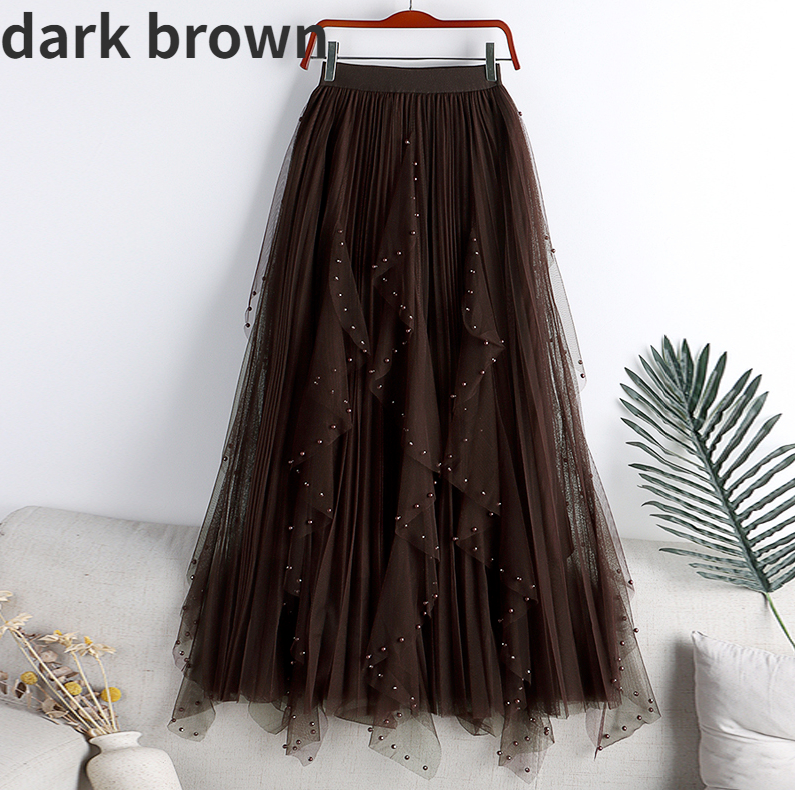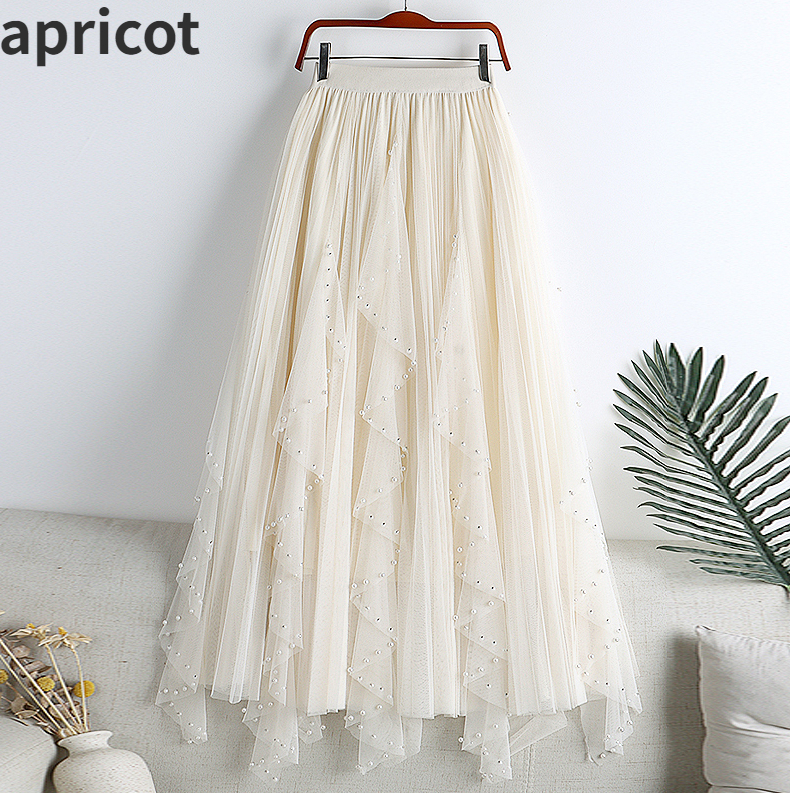 Women Mesh Ruffled Skirt A-line Beaded Gauze Half Dress High Waist Swing Skirt