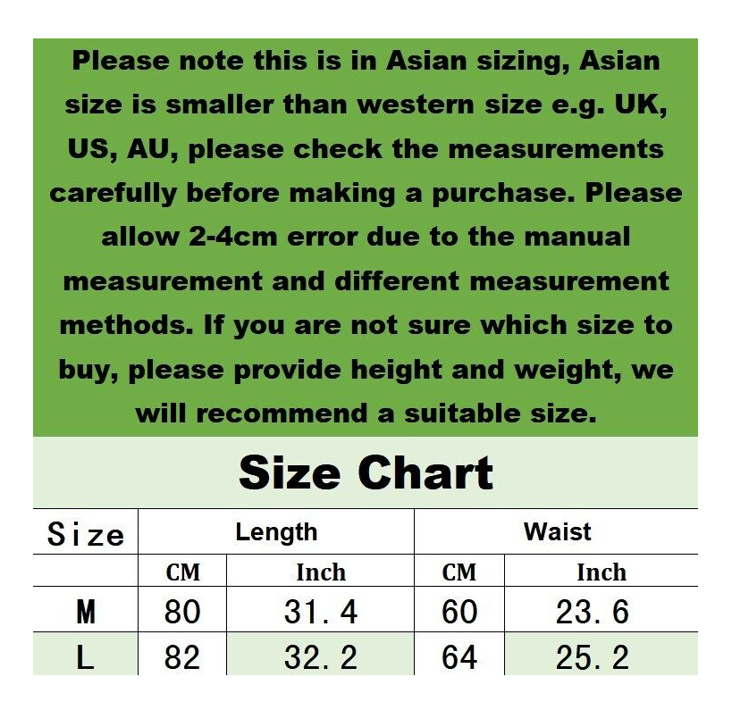 Please note this is in Asian sizing, Asian size is smaller than western size e.g. UK, US, AU, please check the measurements carefully before making a purchase. Please allow 2-4cm error due to the manual measurement and different measurement methods. If you are not sure which size to buy, please provide height and weight, we will recommend a suitable size. Thank you.